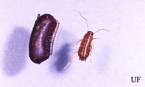 Figure 3. Egg case (ootheca) and early instar nymph of the oriental cockroach, Blatta orientalis Linnaeus. Photograph by Paul M. Choate, University of Florida.